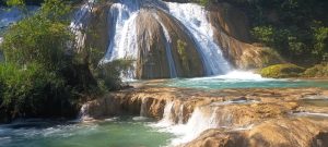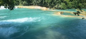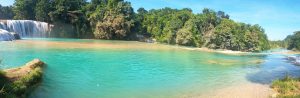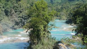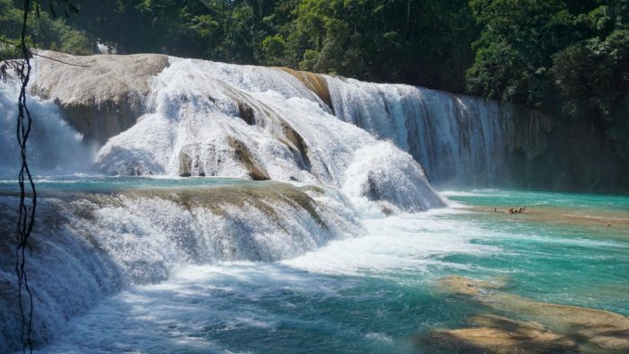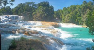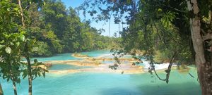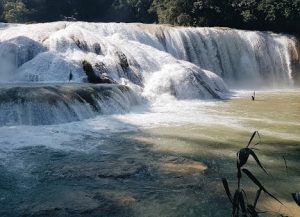 9 Novembre 2025 : Nous n’avons pas fait jusqu’à Palenque 450 km A/R de routes mexicaines pur jus (festival de nids de poules et de ralentisseurs aussi imprévisibles les uns que les autres), uniquement pour le célèbre site Maya. A 60 km (de routes encore plus typiques), se situe Agua Azul, des cascades d’eau bleue turquoise. Outre le risque