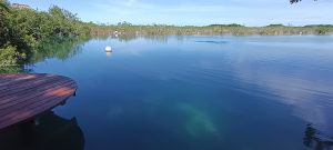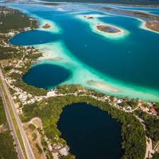 Bacalar est une lagune unique en son genre. Par sa forme extrêmement allongée d’abord : elle mesure 60 km de long sur 8 mètres (canal naturel des Rapidos) à 2 km de large.   Son eau douce très pure et claire issue des cénotes qu’elle abrite (les ronds bleus ci-dessous) lui confère des dégradés de bleus exceptionnels.