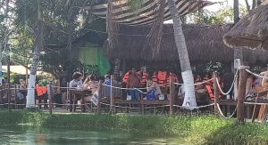 Quelques minutes plus tard, nous distinguons au loin de gros points rouges sur l’eau (?)… ce sont les gilets de sauvetage de la grande attraction de Bacalar nommée ‘Los Rapidos’. Elle consiste à se laisser porter par le courant sur 200 m environ, puis remonter à pied sur le côté pour refaire un tour. Cette soudaine section de 200 m surpeuplée avec restaurant et musique à fond est surréaliste :