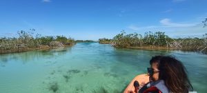 Nous avons donc dû cogiter pour ne pas repartir sans avoir découvert la lagune… et nous avons trouvé la Laguna Bonanza. Un endroit un peu perdu dans la partie Sud de la Lagune. Ce petit secteur, beaucoup moins fréquenté que le Nord en face de la ville de Bacalar, n’est pas concerné par la mesure de protection du Mercredi. Et nous voilà donc en kayak sur l’eau translucide aux 50 nuances de bleu. Le reste se passe de commentaires :