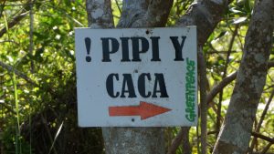 Problème imprévu dans ce cadre idyllique : le lendemain, impossible d’aller sur la lagune. Une récente mesure y interdit toute activité nautique (y compris kayak) chaque mercredi afin de laisser la nature se ‘reposer’ des stress créés par l’homme. Cette mesure parait dérisoire au regard de l’autorisation des moteurs à essence pour les bateaux, et à l’absence d’un réseau d’assainissement pour les constructions qui se multiplient. Car Bacalar commence à être connu, sa fréquentation explose, en particulier celle des Français fuyant le tourisme de masse exacerbé de Cancún. Le panneau ci-contre résume bien les limites du  niveau de surveillance écologique réel.