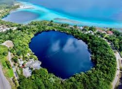 Bacalar est une lagune unique en son genre. Par sa forme extrêmement allongée d’abord : elle mesure 60 km de long sur 8 mètres (canal naturel des Rapidos) à 2 km de large.   Son eau douce très pure et claire issue des cénotes qu’elle abrite (les ronds bleus ci-dessous) lui confère des dégradés de bleus exceptionnels.