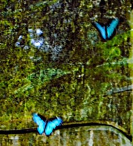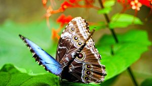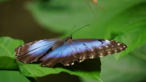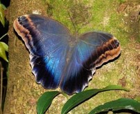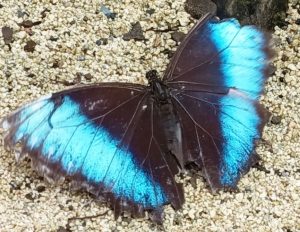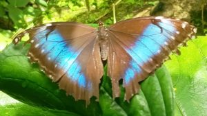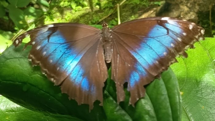 Nous tombons sur la serre des papillons. Dès que nous y pénétrons, les flashes bleus des Morphos nous enchantent.