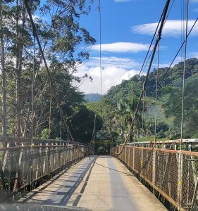 4 Décembre 2025 : Nous quittons notre cabane perdue dans la nature près de Cashi pour rejoindre la côte Pacifique à Uvita (flèche mauve sur la carte).  Deux mots de la route car nous avons battu un record à cette occasion. Après avoir traversé quelques ponts ressemblant plutôt à des passerelles piétons, nous rejoignons la route Panaméricaine qui nous amène jusqu’au Col de la Mort   ou Cerro de la Muerte (3335 mètres tout de même soit quasiment la hauteur du Volcan Irazú). Puis descente interminable  de 2 635 mètres de dénivelé jusqu’à San Isidro del General  (le nom particulier de cette ville ne vient pas d’une visite de De Gaulle, mais de la rivière la traversant, le Rio General). La pente forte est constante pendant 50 km. Au point mort, nous descendions à plus de 80 km/h lorsque les virages le permettaient (pas souvent) !  Nous avons traversé 3 couches de nuages, essuyé 2 averses. Notre record de descente pendant 40 km pour 2000 m de dénivelé entre la Bolivie et San Pedro d’Atacama est largement battu.