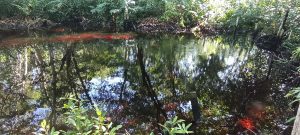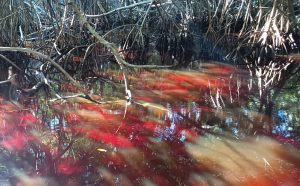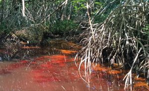 On trouve même un cénote dans la mangrove d’où jaillit un peu d’eau. Mais l’eau de la lagune est tellement chargée et rouge que ce l’est pas la saison pour en apercevoir sa profondeur de 8 mètres (contre quelques dizaines de centimètres pour la lagune) :
