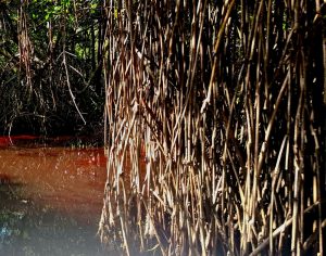 Après les flamants roses, nous pénétrons dans un tunnel de mangrove. Rien d’extraordinaire à priori, ces canaux naturels dans la mangrove sont assez fréquents. Mais ici, waouh ! Les arbres racines sont de taille XXL, et surtout, la couleur de l’eau, rouge en ce moment, donne des reflets fantatstques à ce paysage déjà spectaculaire :