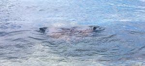 Nous apercevrons une raie pastenague chassant sur le bord dans 15 cm d’eau, comme nous l’avions vu à Moorea depuis le bord :