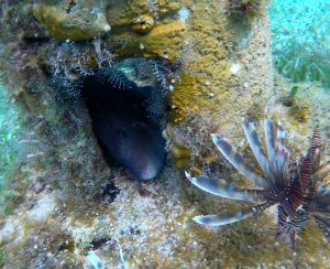 Pour distraire les touristes, des pyramides de béton ont été coulées il y a longtemps par l’hôtel désaffecté. Elles servent depuis de refuge aux rares poissons présents. Ce qui nous permet d’assister à une scène rare : un gros poisson gris expulse 3 poissons lions du temple au sommet de la pyramide (ci-dessous à gauche) pour y faire sa sieste. Et eux attendent sans broncher devant la grotte qu’il ait terminé ! (à droite)