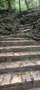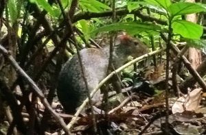 Alors que la plupart des visiteurs retourne vers l’entrée à la fin de la visite (c’est plat et beaucoup plus court), nous avons poursuivi dans la jungle vers la ‘sortie’ ( nombreuses marches en descente). Nous avons énormément apprécié ce chemin à la fois Nature et Culture. D’abord une rencontre avec une sorte d’agouti..