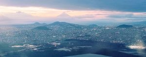 En atterrissant sur l’aéroport de Mexico, nous avions déjà aperçu le Popocatépetl (le cône qui fume au fond) et l’Iztaccihuatl (la crête de même altitude quasiment à gauche) avec le col du Paseo de Cortès entre les deux, notre objectif d’aujourd’hui :