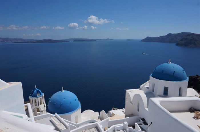 Depuis la gare routière de Fira, nous atteignons en 45′ le village le plus élevé du bord de la caldeira : Imerovigli. Probablement le plus beau point de vue du cratère submergé car se dresse devant nous, sur une presqu’île, un spectaculaire rocher type Monument Valley aux USA : Skaros.