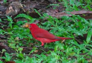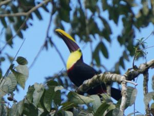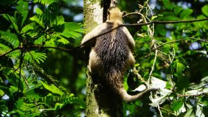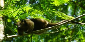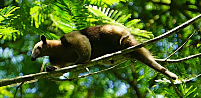 Après nous être demandés s’il s’agissait d’un opossum, Internet nous a confirmé que nous avions affaire un fourmiller Tamandua Tridactyle. Il ne nous calcule pas, grimpe sur le tronc d’un arbre pourri, arrache le bois qui tombe par terre pour avaler les fourmis. Lorsqu’il arrive au sommet du tronc, nous pensons qu’il va redescendre et que nous allons l’admirer d’encore plus près. Et bien non ! Il s’accroche à une branche voisine toute fine et se déplace de branches en branches, à 15 m au-dessus du sol, presqu’aussi à l’aise qu’un singe. En regardant de près ses pattes, nous comprenons que cette facilité provient probablement d’une énorme griffe au centre bordée d’une griffe plus petite de chaque côté (nous n’étions pas encore au courant de son côté tridactyle).