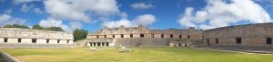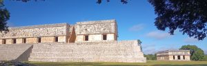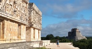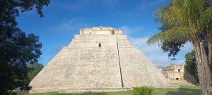 7 Novembre 2025 : Après une nuit dans un hôtel improbable dans le village perdu de Sacalum, nous arrivons sur le site d’Uxmal (pile au Sud de Merida) à 8h00 pour l’ouverture. Et là, grande surprise, nous sommes seuls à prendre les billets. Opposition totale avec l’autre grand site Maya du Yucatan : Chichen Itza. Pas un seul vendeur de bibelots, pas un seul bus de l’usine à touristes de Cancun, personne ! Apparament, les tours opérateurs de la Riviera Maya misent tout sur Chichen Itza et rien sur Uxmal, à 5 heures de Cancun soit le double. Et pourtant les vestiges datent de plus de