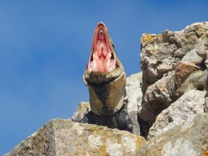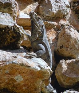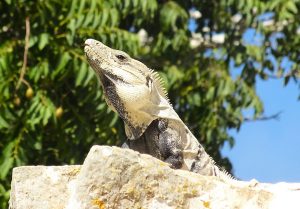 A partir de 9h30, une foule d’iguanes arrive pour se réchauffer au soleil, en même temps que les premiers groupes de touristes. Après avoir eu le site pour nous, nous nous sentons presque envahis, alors que même en comptant les iguanes, nous n’atteignons pas 10% de la foule de Chichen ITZA. Et sans aucun marchand de bibelots, ils sont ici interdits :