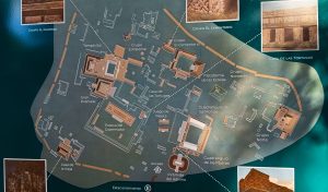 Le palais du gouverneur, immense, imposant mais finement sculpté, avec en premier plan un trône royal représentant un jaguar :