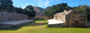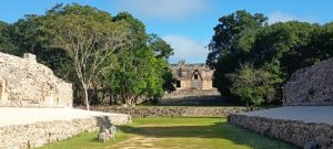 Le jeu de pelota, nettement plus petit qu’à Chichen Itza. On distingue l’anneau par où devait passer la balle de chaque côté :
