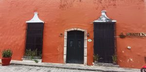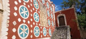 En revanche, le centre de la petite ville de Uayna à quelques kilomètres de Valladolid nous a enthousiasmé avec son couvent Santo Domingo. Construit à partir de 1648 pour évangéliser les Mayas, il a été réhabilité en 2005 Un habitant rencontré sur le parvis nous a raconté qu’il avait participé à la peinture… mais pas trop en hauteur… Les rosaces, symbolisant la vierge, abondent sur fond rouge symbolisant le sang du Christ. Ne ne connaissons aucun monument de ce style dans le monde. Si vous en connaissez, merci infiniment de bien vouloir nous l’indiquer dans les commentaires  :