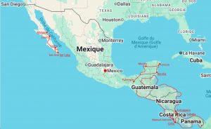 En orange et rouge, les trajets parcourus en Basse-Californie (2 semaines), autour de Mexico (une semaine y compris Popocatepetl et Taxco), dans la péninsule du Yucatan (4 semaines), et au Costa Rica (2 semaines).